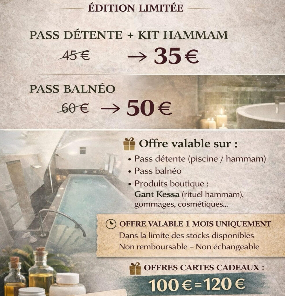 Dès votre arrivée, vous êtes enveloppé par une ambiance douce et apaisante : la lumièretraversante, les notes délicates du sauna et hammam, la chaleur bienfaisante de la piscine à jets et le parfum des infusions dans notre tisanerie. Chaque espace est pensé pour vous offrir une expérience immersive et revitalisante.