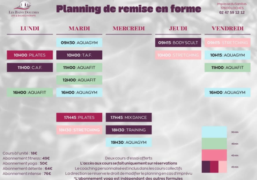 Cardio, aquagym, pilates, stretching, renforcement, yoga …